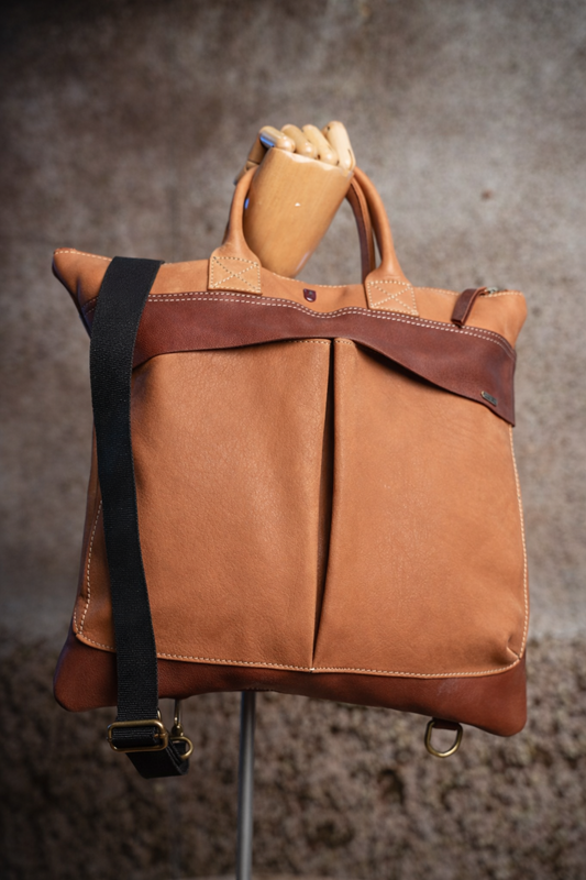 Bolso de cuero. Bolsillo con cremallera interior. Bolsillo superpuesto con cremallera y pasamanos de piel. Tejido central algodón. Colores marrón.