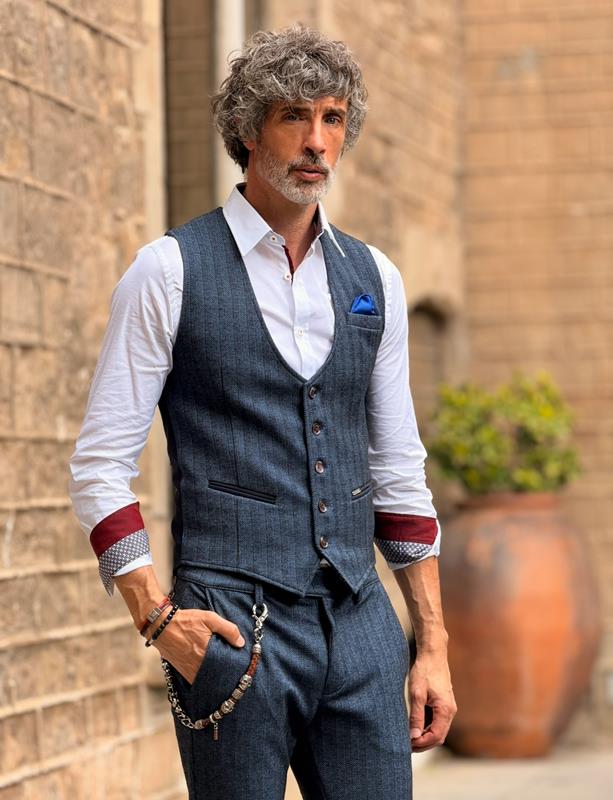 Chaleco con tejido de punto, con solapa en color azul. Rayas diplomáticas, color azul. Parte trasera elástica en color azul marino, cierre con hebilla.