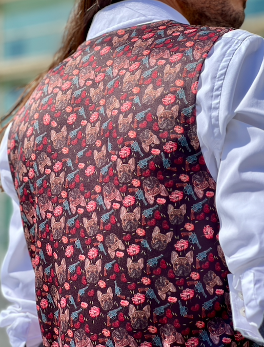Chaleco parte frontal con tejido de punto, color gris, con solapa. Parte trasera con estampado guns.