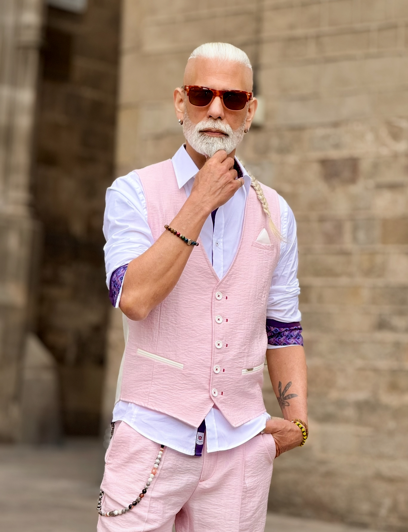 Chaleco con tejido de lino, parte trasera elástica en color beige.
