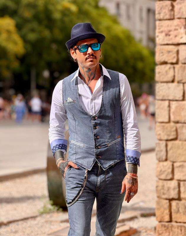 Chaleco con tejido de punto, parte frontal en color Blue denim, solapa. Parte trasera elástica denim.