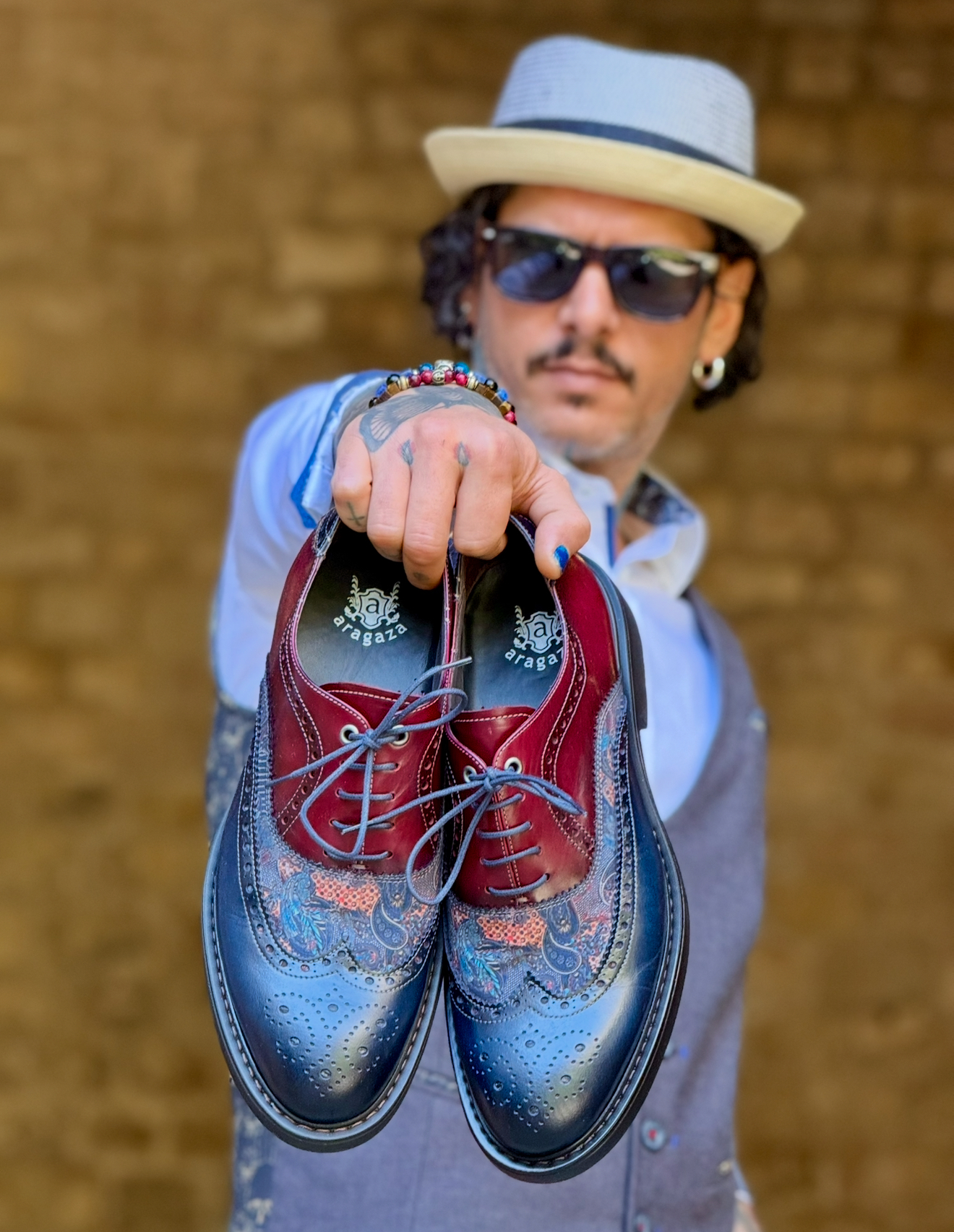 Zapatos de piel, estilo blucher. Diseño casual y moderno. Cierre al empeine mediante cordones que facilitan su colocación. Plantilla interior almohadillada y suela ligera de goma. Colores azules y bordeos. Empeine estampado cachemire.